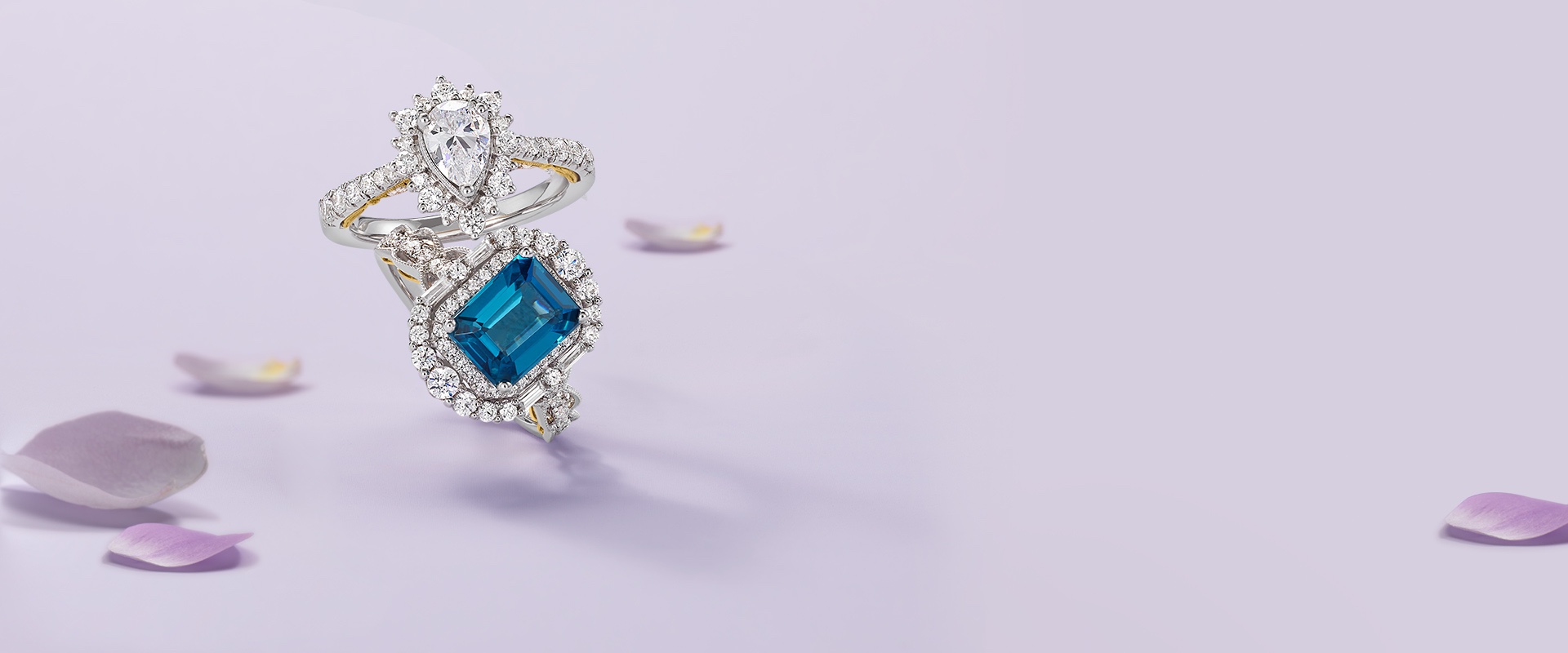 The Zac Posen collection includes a selection of gemstone engagement rings for brides-to-be looking for a pop of color. This collection features many of the same design elements as the diamond collection, such as detailed bands and halo designs. Gemstone options include aquamarine, morganite, and blue topaz.